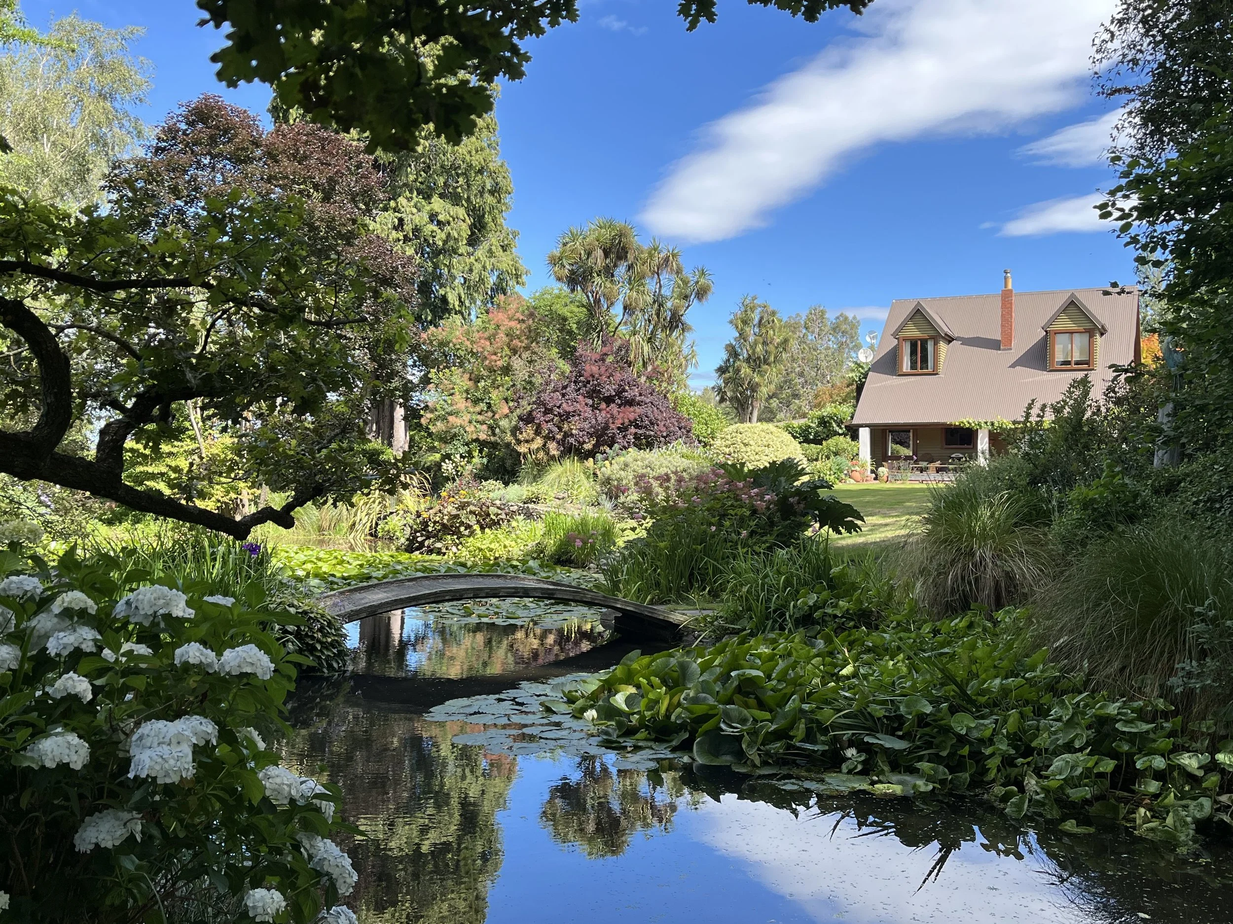 A gracefully arched bridge leads your eye to Mt Tekoa. This is a garden which celebrates its vistas. Stone walls and heavy bridge timbers add to the generous country style planting in the swimming pool area and rose garden.